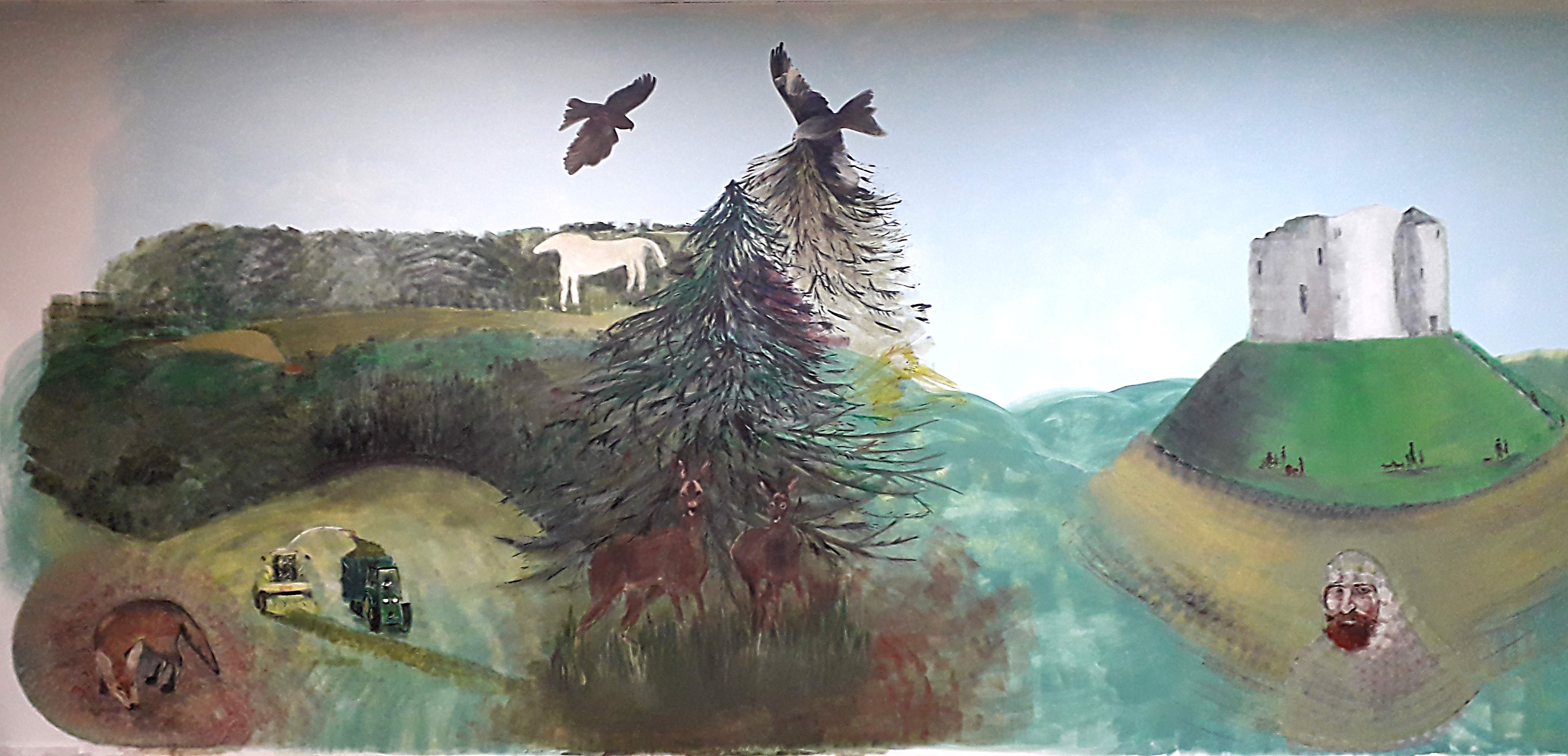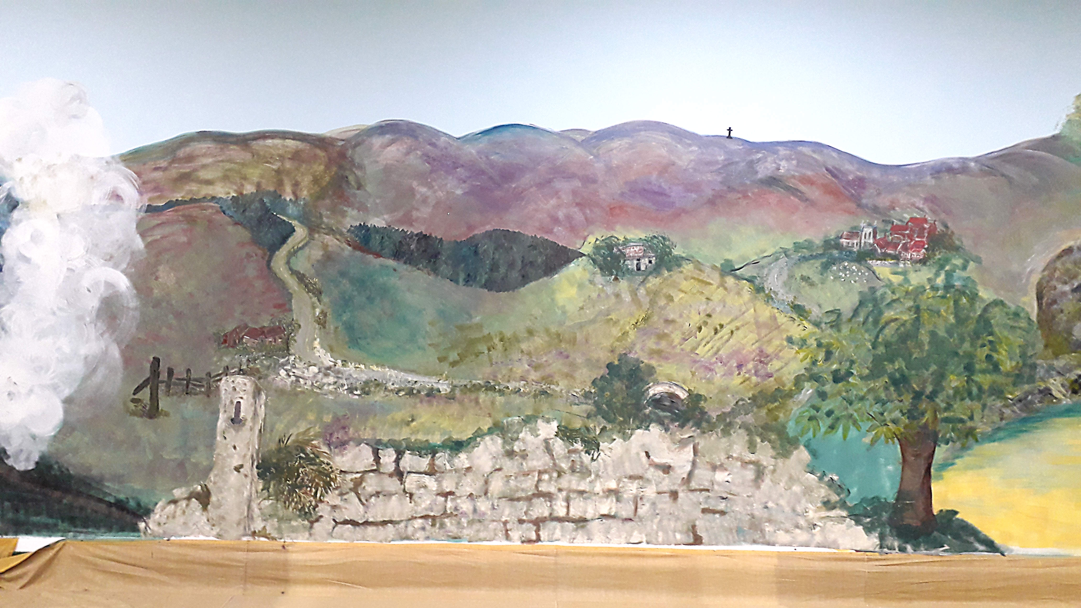 During the summer of 2025 the blank wall adjacent to rink number 5 was painted with a mural depicting the countryside surrounding the bowling club. Roughly speaking, running from left to right the mural shows local scenes going from west to east. In all, the mural is about 3 metres tall and over 30 metres long. Some pictures of the work in progress are given below.
